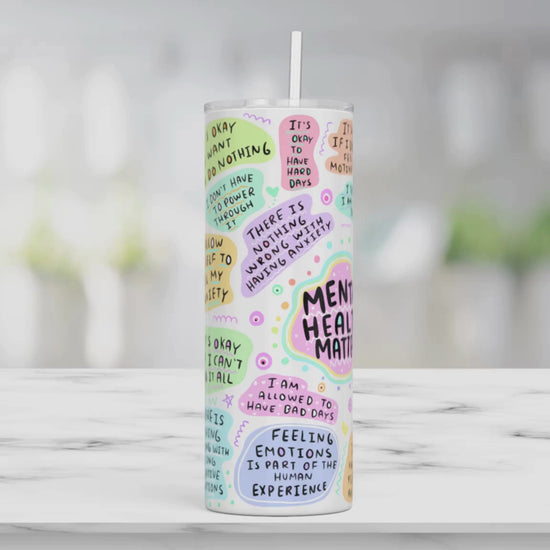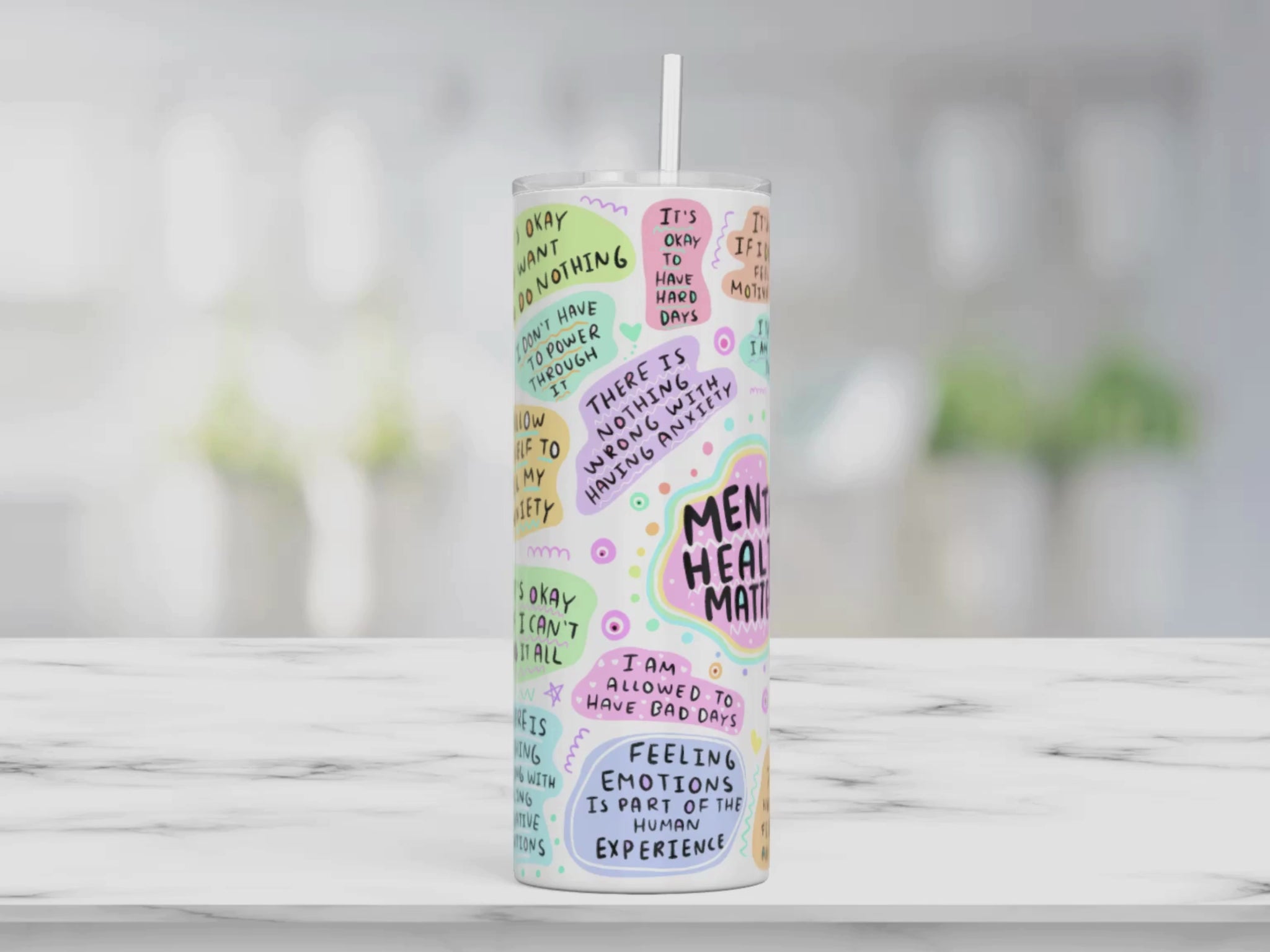 Spread positivity and self-love with this vibrant 'Mental Health Matters' tumbler design! Featuring uplifting affirmations like 'It's okay to cry' and 'I am allowed to have bad days,' this tumbler serves as a daily reminder to prioritize your mental well-being. Perfect for anyone who values self-care and emotional health, this design adds a touch of encouragement to your favorite drinks. Stay inspired and hydrated with this empowering tumbler!